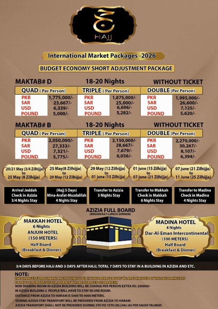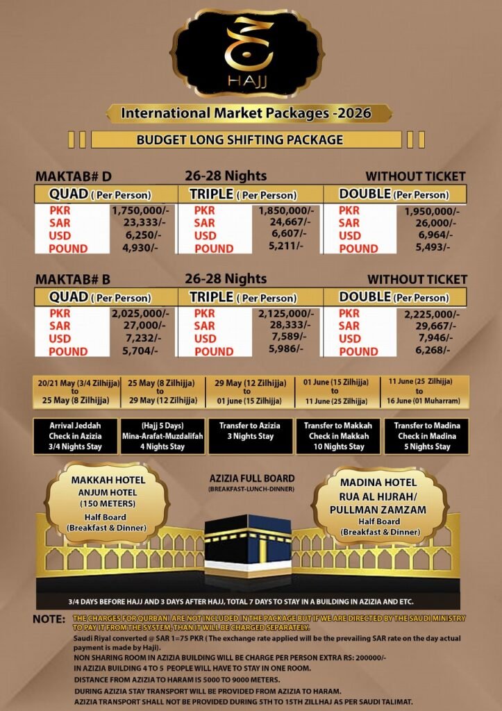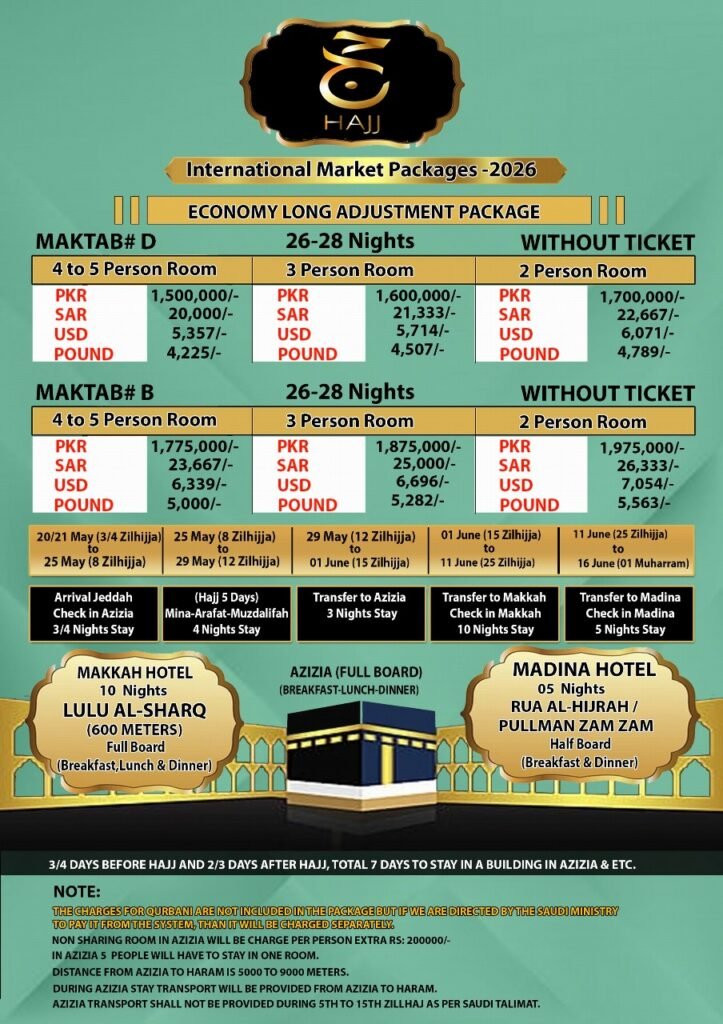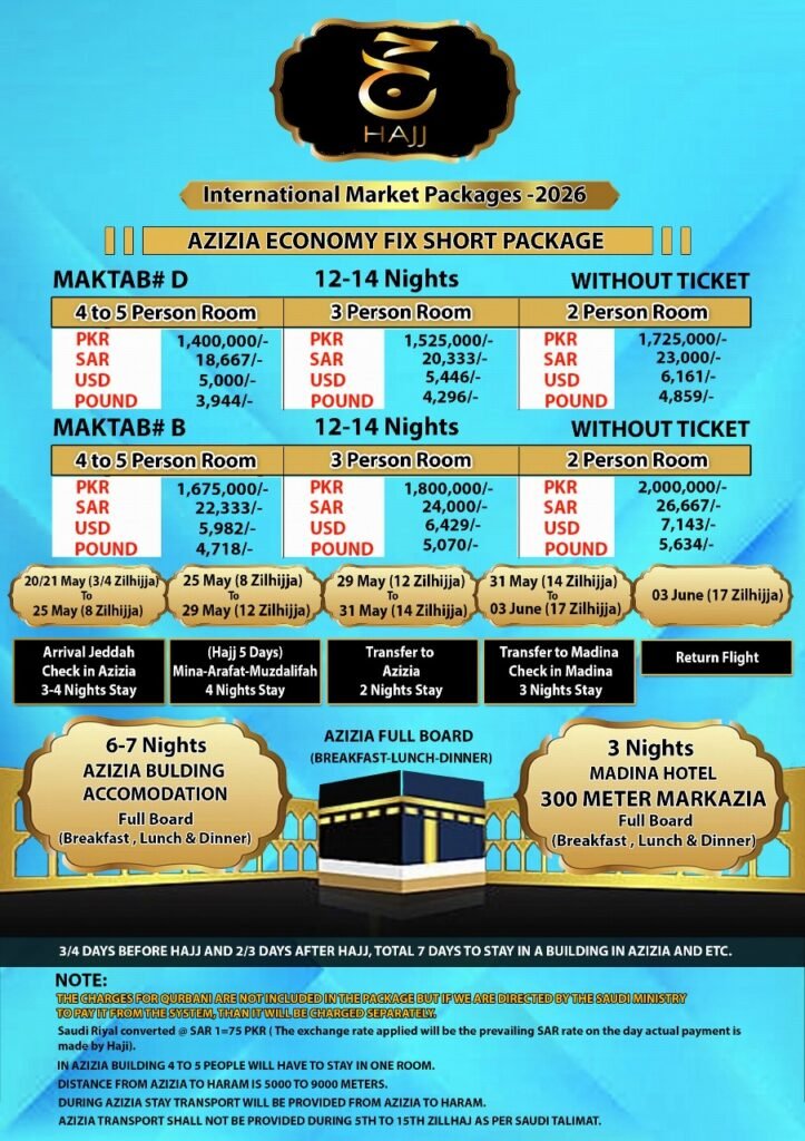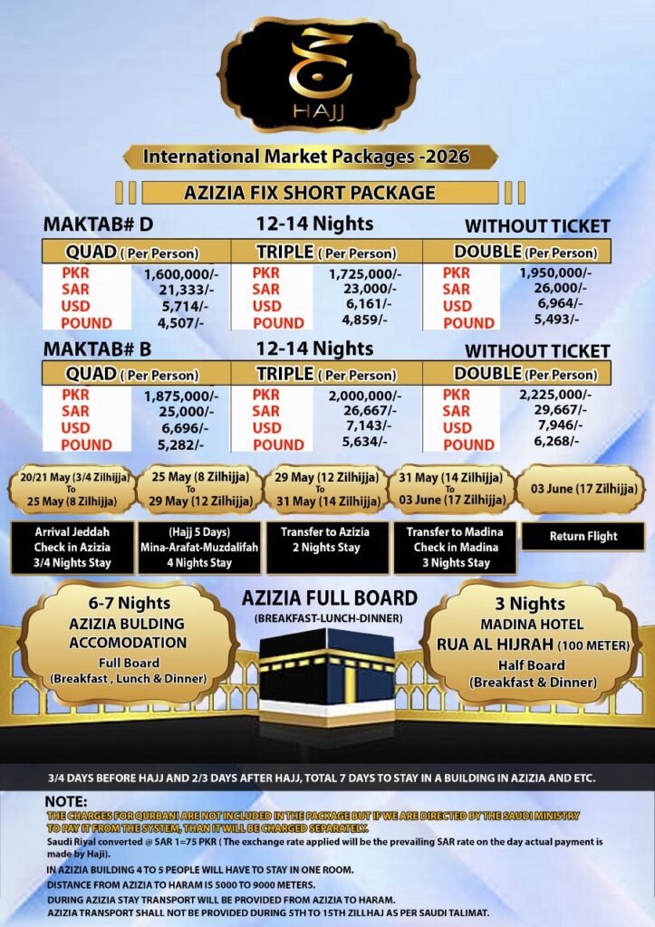 Important Note: Qurbani charges are not included and will only be added if directed by the Saudi Ministry. Shared rooms in Azizia will be arranged with 4–5 persons per room.